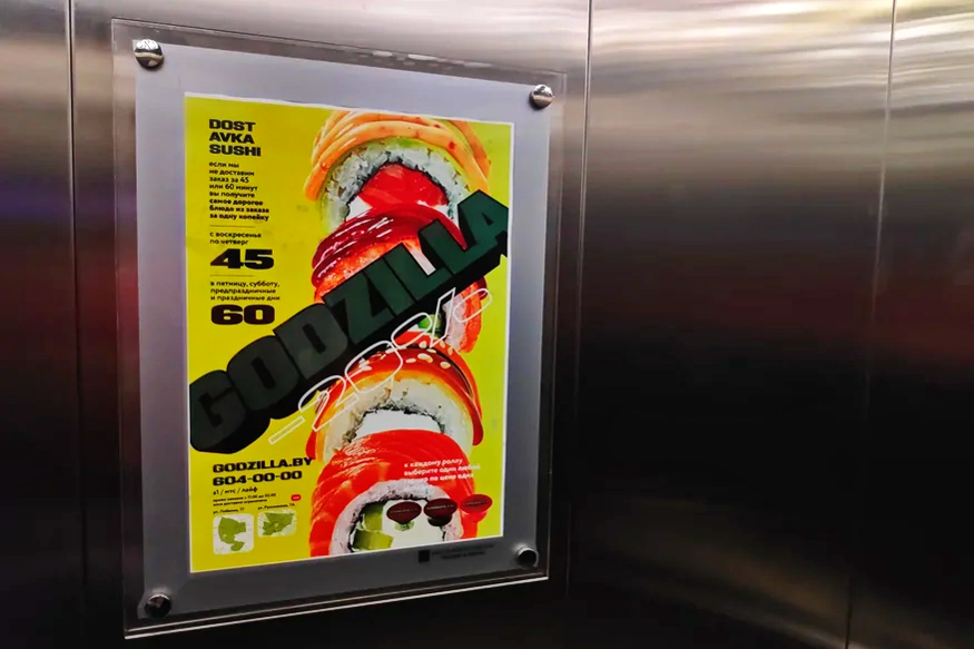 Рекламная кампания новой доставки суши GODZILLA на форматах LCD-media.