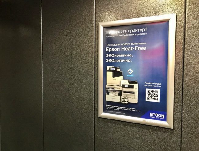 Рекламная кампания принтеров от EPSON с технологией Heat-Free в бизнес-центрах.