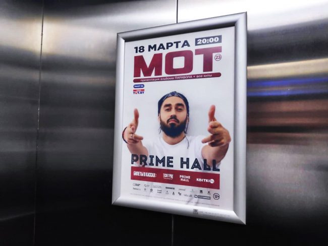 Рекламная кампания сольного концерта артиста лейбла Black Star Мота в бизнес-центрах Минска.