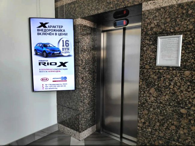 Рекламная кампания нового автомобиля KIA Rio X в бизнес-центрах Минска.