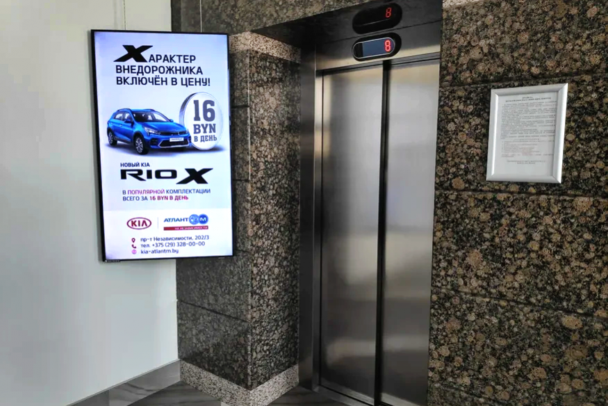 Рекламная кампания нового автомобиля KIA Rio X в бизнес-центрах Минска.