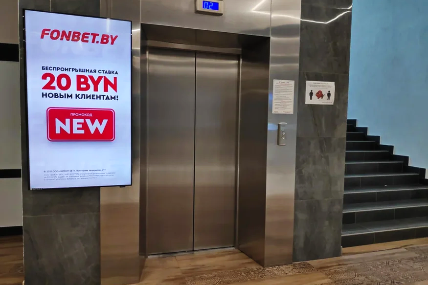 Рекламная кампания специального предложения от букмекерской компании Fonbet в бизнес-центрах.