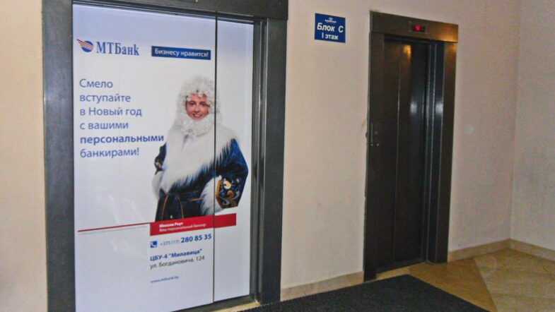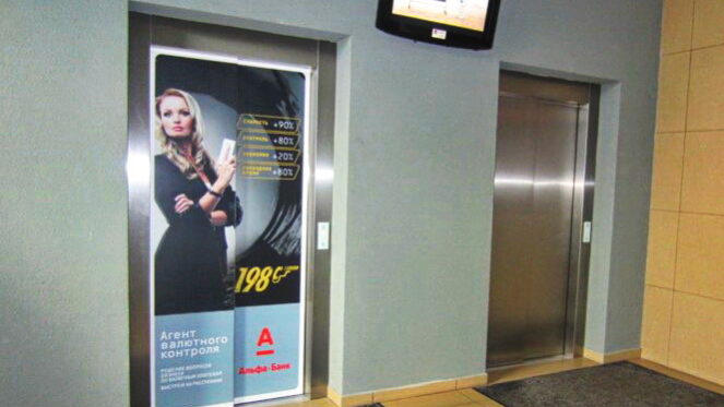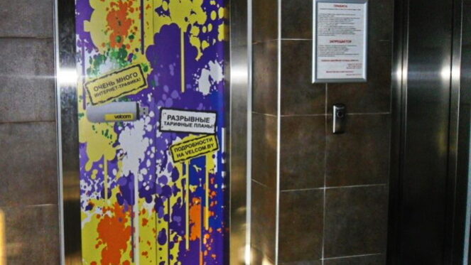 стикер с защитной матовой ламинацией, размещенный на всю величину двери лифта с внешней стороны.